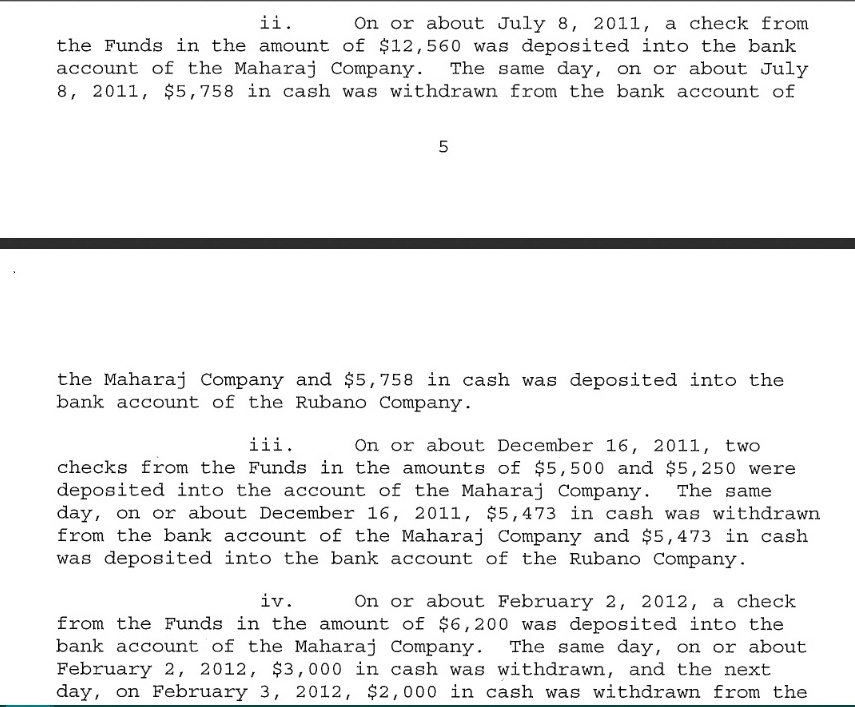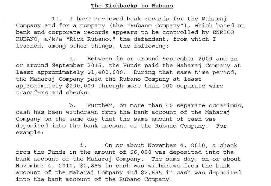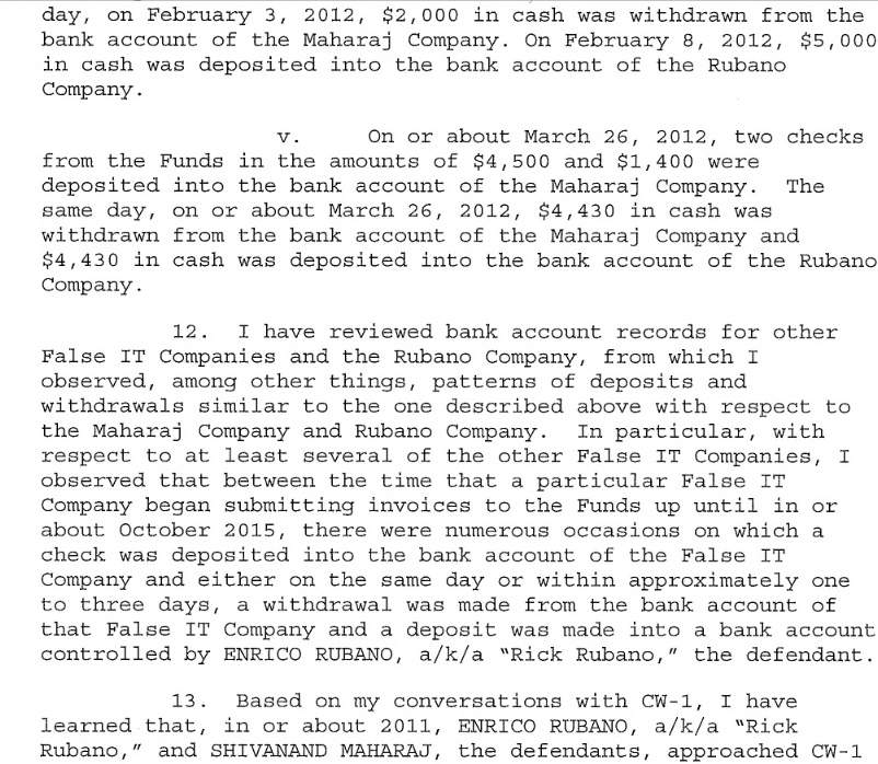 According to the superseding indictment (read it here), Rubano, Maharaj “and their co-conspirators devised a scheme for Rubano to accept kickbacks from Maharaj and others” for referral of IT work “that was never performed” by companies identified as Maharaj Ltd., Sytrex LLC, and Z Tech Solutions. Rubano then allegedly submitted false invoices, which were paid by the Funds. Rubano and other unnamed co-conspirators, without Maharaj’s involvement, allegedly were involved in a similar scheme in which Rubano is also accused of accepting kickbacks for IT work that was never performed by two other companies identified as CVJ Consulting and GE Tech Consultants.