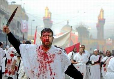 157_ An Iraqi Muslim Shi'ite flagellates himself outside Imam Mussa al-Kazem shrine in central Baghdad at the peak of Ashura, which marks the death of Imam Hussein, grandson of Prophet Mohammed.