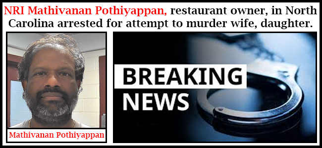 NRI Mathivanan Pothiyappan, restaurant owner, in North Carolina arrested for attempt to murder wife, daughter.