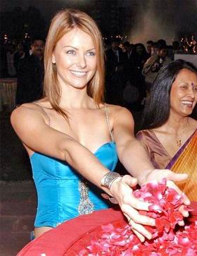 118- Miss Universe 2004 Jennifer Hawkins offering floral tribute to the statue of Bharat Mata in Lucknow, India