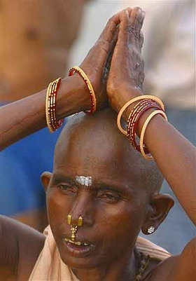 173 A woman sadhu prays after taking a dip in the Sangam, the confluence of the rivers Ganges and Yamuna, in Allahabad. The nine-day long Navratri festival began on April 9.