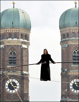175 Swiss artist Freddy Nock walks on a high-wire 30 meters above Munich's central pedestrian area. The performer traveled 590 feet while 98 feet above ground level on a rope suspended between two cranes