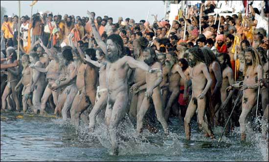 Au naturale ... Indian holy-men, known as Naga Sadhus, who have renounced the wearing of clothes, take part in ritual bathing in the Ksipra river during the Kumbh Mela festival in Ujjain. Photo: AFP