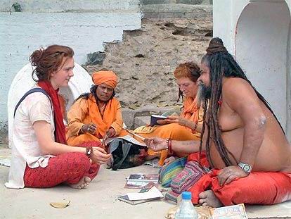 A foreigner lady talks with a Sadhu at Ramghat at the banks of River Kshipra in Ujjain. About 3 crore devotees are to take holy dip at this Ghat during one month long Simhastha festival which starts from Monday.