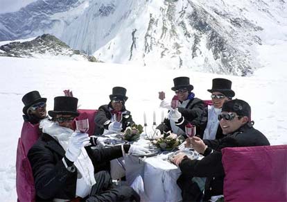 ![]() This photo made available in London on Monday, May 10, 2004, shows, clockwise from front left, Caio Buzzolini, Rob Sully, Henry Shelford, Nakul Pathak, Tom Shelford and Robbie Aitken near the 7,045m (23,113ft) summit of Lhakpa Ri in Tibet on May 3, 2004. The team, six Britons, completed their world record for the highest altitude formal dinner by carrying tables, chairs, silver cutlery and a five-course meal to the top of the peak. |
