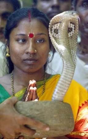 ![]() An Indian woman worships a poisonous snake during the Hindu festival 'Nag Panchami' in the village of Khadiatola, about 90 km (56 miles) north of the eastern Indian city of Calcutta. About 50,000 devotees attended the festival on Tuesday to worship the snake goddess. The snake is one of the most revered animals in Hinduism. REUTERS-62 |