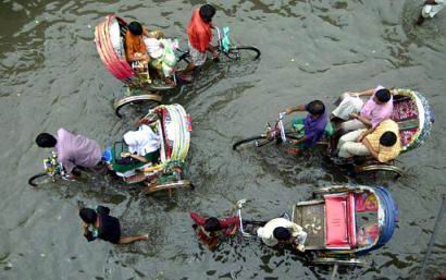 ![]() Cycle rickshaws wade through ankle-deep water after a heavy rain in Dhaka, Bangladesh. Monsoon flood waters have killed five people, marooned at least half a million others in their villages and destroyed crops, r oad, rail lines in Bangladesh, officials said. (AP Photo/Pavel Rahman) -69 |