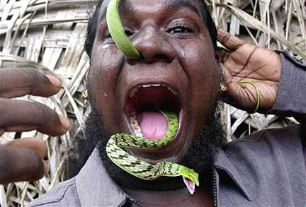 C. Manoharan Snake Manu practices a trick with a garden snake by running it through his nose and out his mouth in an attempt to create a Guinness Record in Madras, India. Manu plans to set the record by using a live cobra.