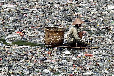 in Jakarta. Hundreds of meter squares of garbage are floating