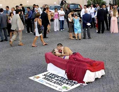 Treatment of Animals kiss as they protest in a bed set up in the centre of Rome.