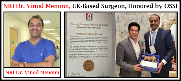 NRI Dr. Vinod Menon, a UK-based Consultant Surgeon, has been awarded Honorary Life Membership by the Obesity Surgery Society of India (OSSI) in recognition of his outstanding contributions to leadership, teaching, training, and advancing care for patients with severe and complex obesity.