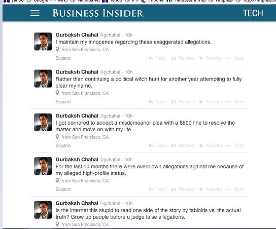 After his conviction, Chahal tweeted, "I maintain my innocence regarding these exaggerated accusations"; "For the past 10 months there were overblown allegations against me because of my alleged high-profile status"; and "Is the Internet this stupid to read one side of the story by tabloids vs. the actual truth? Grow up people before u judge false accusations."
