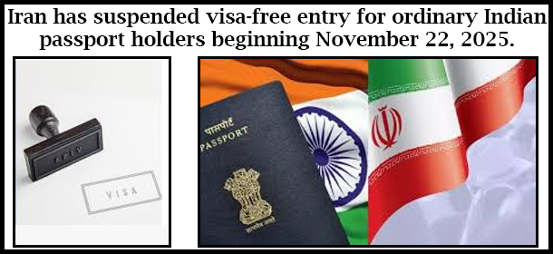- Iran has suspended visa-free entry for ordinary Indian passport holders beginning November 22, 2025.