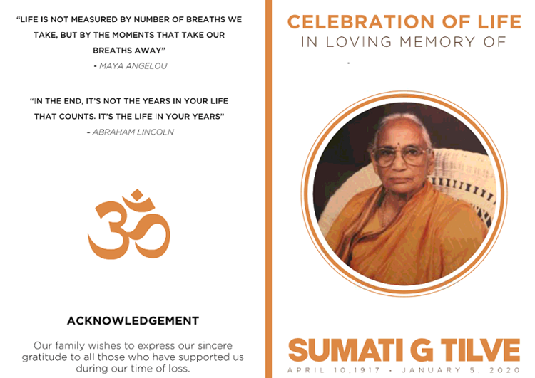 Sumati G.Tilve has left long legacy with 13 grand children and 3 great-grand children.