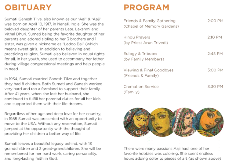 Sumati G. Tilve was born in home of Lakshi and Vithal Dhuri in village name Naneli, state of Maharashtra, in India on April 10, 1917. She was beloved daughter of her parents. She had very progressive views as a teenager she accompanied her father to congressional meeting in her village and helped everyone. In 1934 she got married and had 8 children. Both parents worked hard in farm to raise their children.