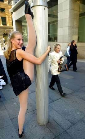 pole to stretch before joining fellow-dancers for a performance in Martin