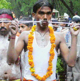 Devotees of Shitla Mata with iron rods pierced through cheeks take out a procession in Sukhna Lake in Chandigarh