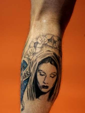 The leg of German handball player Stefan Kretzschmar with a tatoo of his girlfriend German freestyle specialist Franziska van Almsick is seen during the handball match between Germany and Greece at the Athens 2004 Olympic Games. REUTERS-60