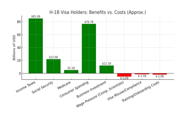 Dr. Abraham further said that he asked ChatGPT to provide info on the US benefits and costs of H-1B Visa program, which was provided as Bar Chart showing the benefit and cost of this program. The economic contribution to the is over $200 Billion annually while the cost associated with it is $8.5 Billion. The net contribution is overwhelmingly large positive, demonstrating the critical role of skilled foreign professionals in sustaining U.S. innovation.