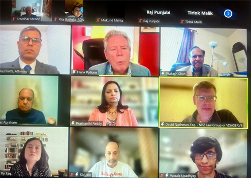 Rep. Frank Pallone with GOPIO officials and speakers at the Webinar, From l. to r., Top Row: Dilli batta, Rep. Frank Pallone Jr., Prakash Shah; Middle Row: Dr. Thomas Abraham, Prashanti Reddy, David Nachman; Bottom Row: Stephanie Dy, Siddarth Jain and Vatsala Upadhayay |