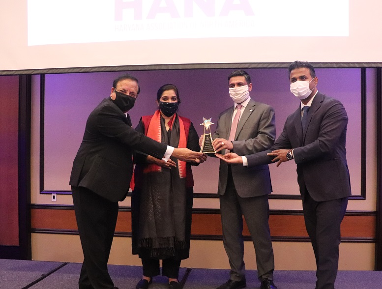 Kuldeep Sharma, President of The Haryana Association of North America (HANA) of 7045 Edward Blvd, Suit 300 Mississauga and Indian Consul General Apurva Srivastava presented the award to Sandeep Goel, CEO of ICICI Bank in Canada.