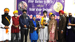 At the time of opening ceremony and prize distribution ceremony Kalvinder Singh Fresno, President Gatka Federation USA, Dr Deep Singh General Secretary World Gatka Federation (WGF), Himmat Singh Coordinator World Sikh Parliament (WSP), Rajinder Singh Baba Banda Singh Bahadar Society, Sarabjit Singh Sahni, Guru Gobind Singh Sikh Study circle, accompanied by Sarabjit Kaur Westchester County & S Daler Singh, President Baba Makhan Shah Lobana Sikh Center NY.