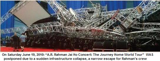 On Saturday June 19, 2010: “A.R. Rahman Jai Ho Concert: The Journey Home World Tour” was postponed due to a sudden infrastructure collapse, a narrow escape for Rahman's crew. Detroit and Toronto had been rescheduled due to the incident. Rahman said, "It’s a miracle my team escaped with minor injuries and thanks to the almighty that everyone's safe."