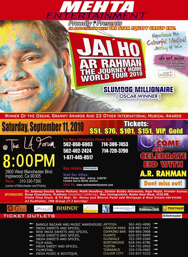 Here are the tour dates for the A.R. Rahman Jai Ho Concert: The Journey Home World Tour: