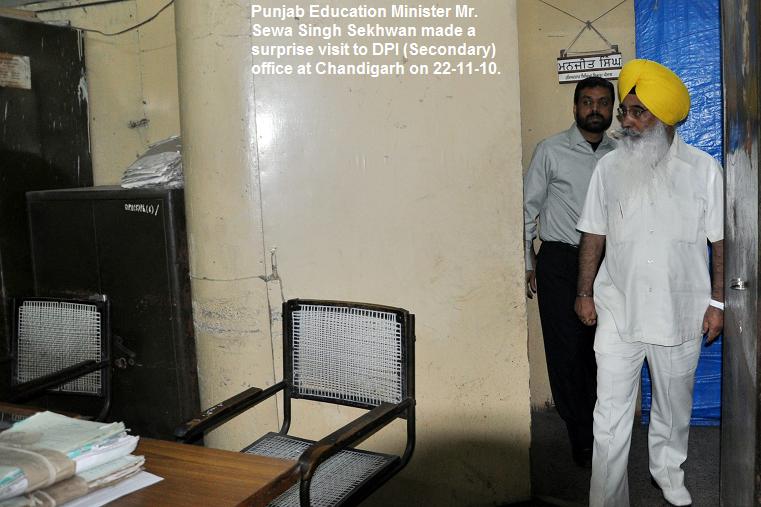 Chandigarh November 22: Empty benches and piled up pending files greeted the Education Minister Mr. Sewa Singh Sekhwan as he raided the Director Public Instructions (S) office without any notice. 32 officers/officials including 2 Assistant Directors, 1 superintendent were found absent from the office without any sanctioned leave. The Minister was given undated applications of some employees.