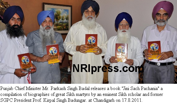Punjab Chief Minister Mr. Parkash Singh Badal today released a book "Jini Sach Pachania" a compilation of biographies of great Sikh martyrs, who attained martyrdom to uphold the supreme values of Sikhism by an eminent Sikh scholar and former SGPC President Prof. Kirpal Singh Badungar.