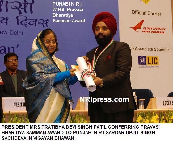 President of India Mrs Pratibha Devi Patil conferred Pravasi Bharatiya Samman Award to Jalandhar born Punjabi Non Resident Indian SARDAR UPJIT SINGH SACHDEVA for his outstanding contributions in Philanthropic and charitable work and Building closer links between India and overseas indian .