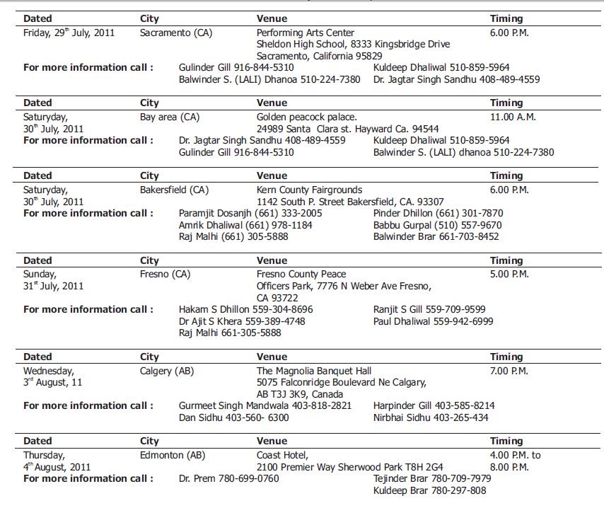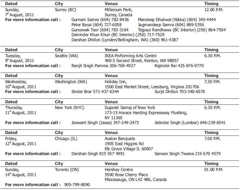 NORTH AMERICA TOUR OF S. MANPREET SINGH BADAL( July 29- Aug 14) Accompanied by S. Jagbir Singh Brar, S. Kushaldeep Singh Dhillon, S. Gurpreet Singh Bhatti, Sh. Bhagwant Mann & S. Darshan Singh Brar.