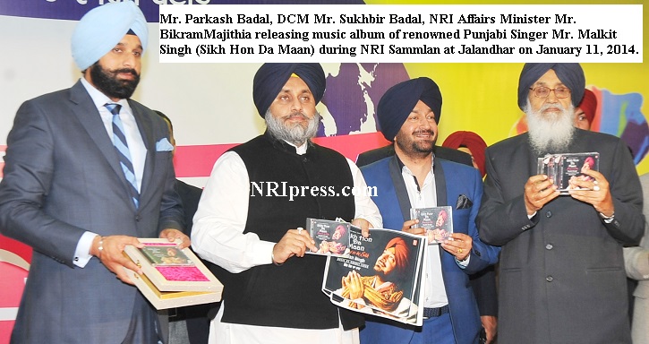 Punjab CM Mr. Parkash Singh Badal, Deputy CM Mr. Sukhbir Singh Badal, NRI Affairs Minister Mr. Bikram Singh Majithia releasing music album of renowned Punjabi Singer Mr. Malkit Singh (Sikh Hon Da Maan) during NRI Sammlan at Jalandhar on January 11, 2014.