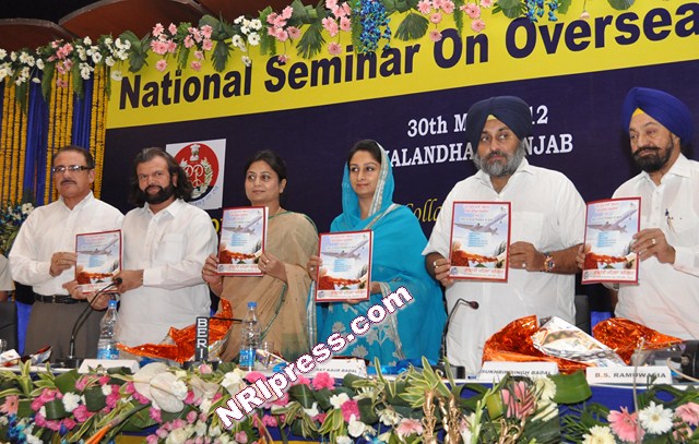 Photo 2: Punjab Deputy Chief Minister Mr. Sukhbir Singh Badal along with Member Parliament from Bathinda Mrs. Harsimrat Kaur Badal, former Union Minister Mr. Balwant Singh Ramoowalia, Mrs. Shamina Shafique from National Commission for Women and Renowned Punjabi singer Mr. Hans Raj Hans releasing the souvenir of National Commission for Women, which was translated by Punjab Police in Punjabi language, during seminar on ‘Overseas Marriages’ at Jalandhar on May 30, 2012.