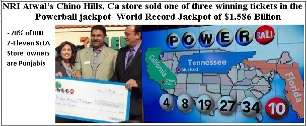 .                 NRI Atwal’s store sold one of three winning tickets in the Powerball jackpot                                                      -World Record Jackpot of $1.586 Billion-Franchisees of 7-Eleven--gets 50% only