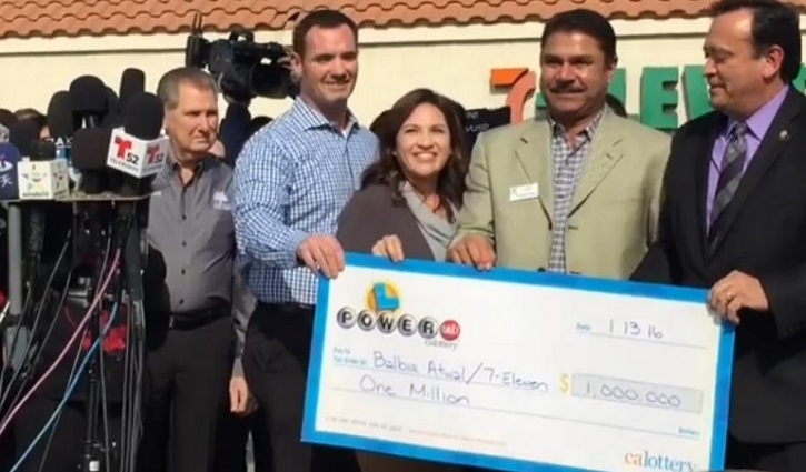 Hills’s 7-Eleven Store owner Balbir Atwal who sold one of three winning   tickets in the $1.6 billion record Powerball jackpot, received  $1   million check as shown above.     The   three winners did not identify themselves, but in California it gives   its winners a year and in Florida  and Tennessee  they must claim their   winnings within six months.   In Florida or Tennessee  have no state income tax and California,   exempts winnings from lottery tickets bought in-state. The three winner   must pay $368 million each in federal income tax around 39.6%.  Chino   Hills is almost 30 miles  east of Los Angeles and hundreds of people   crowded into the 7-Eleven store, chanting "Chino Hills! Chino Hills!"