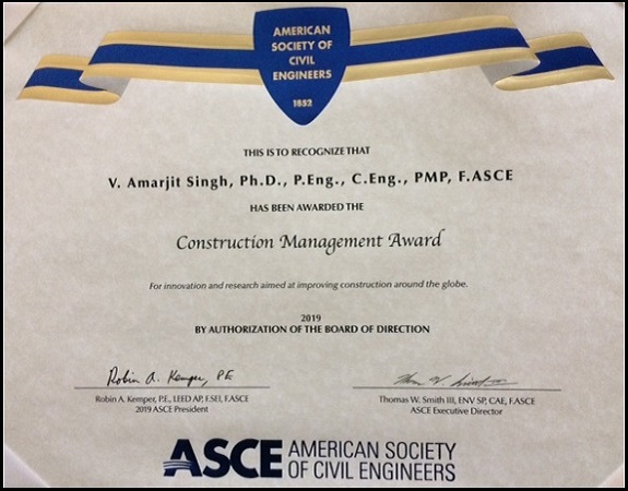 NRI Professor (Dr.) Amarjit Singh was awarded the most prestigious Construction ManagementOnly one award is given in any year at an annual function of the American Society of Civil Engineers