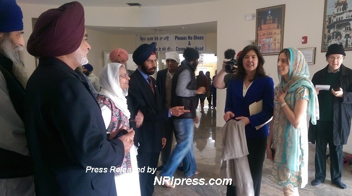 In a press conference while meeting with the Gurdwara board and community leaders, packed with mainstream major media reporters and cameras, she and her associates were given an educational presentation “Who Are the Sikhs?” by Amrith Kaur Aakre highlighting the salient features of Sikh Religion, with emphasis on equality of mankind. Through the presentation, valuable bits of information were shared such as the fact that post 9/11, Sikhs bore the blunt of bullying and hate crimes. Efforts to stop hate crimes and bullying within the Sikh community were discussed.