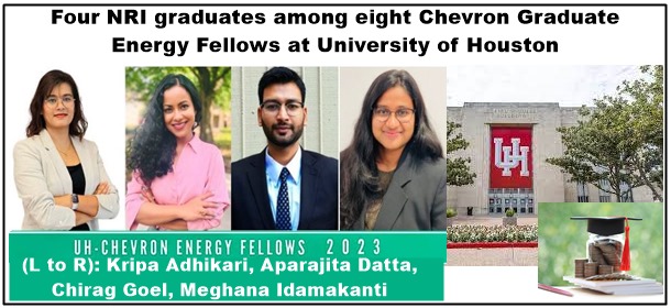 Four NRI students of the University of Houston Kripa Adhikari, Aparajita Datta, Chirag Goel, Meghana Idamakanti have been named among eight who received the inaugural 2023 Chevron Graduate Energy Fellowship for actively being involved in innovative energy-related research. Funded by Chevron, the programme supports graduate students' research efforts through a one-year USD 12,000 fellowship which includes mentoring by faculty experts and the opportunity to engage with subject matter experts at Chevron.