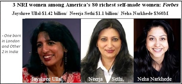 Three NRI women, Jayshree Ullal who was born in London and raised in New Delhi, Neerja Sethi and Neha Narkhede, both born in India, created new businesses and amassing fortunes than ever before. List members range in age from 21 to 92, and are worth a combined USD 81.3 billion. Around 38 women , live in California. 9 women live in New York. 19 women were born in other countries.