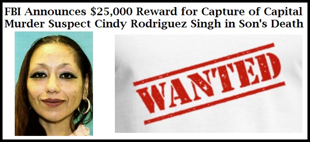 On August 29, Dallas FBI Special Agent in Charge Chad Yarbrough, along with Everman, Texas, Police Chief Craig Spencer, revealed a reward of up to $25,000 for information that leads to the capture and conviction of Cindy Rodriguez Singh. She is a capital murder suspect accused of killing her young son, Noel Alvarez.