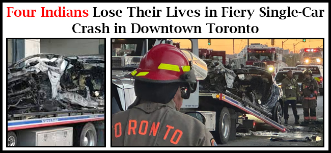 A single-car accident on Lake Shore Boulevard East near Cherry Street in Toronto claimed the lives of four Indians. Police report that a Tesla carrying three men and two women crashed at approximately 12:10 a.m. after the driver lost control, hitting a guardrail and crashing into a concrete pillar, which ignited a fierce blaze. Four adults inside were pronounced dead at the scene, while a fifth, a 25-year-old woman, was rescued by a passing Canada Post driver.