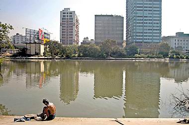 128_ A man takes a bath at a pond near high rise buildings in Kolkata, India