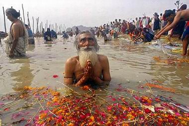 129-A Hindu holy man offers prayers to the sun after taking a holy dip during the annual traditional fair of Magh Mela in Allahabad, India