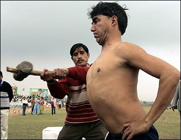 to be hit on the torso with a hammer at the Kila Raipur traditional