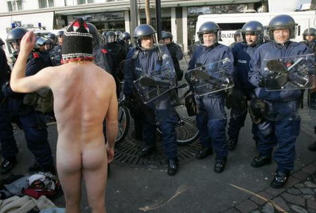 Nude protester stands in front of a row of riot