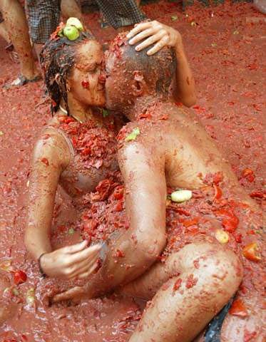 Revellers kiss each other in a pool of tomato pulp during the annual
