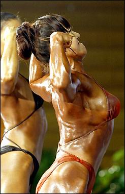 Flexing in Seoul : South Korean woman bodybuilders show their muscles during a contest at Seoul's Olympic gymnasium. (AFP)