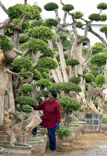 Thai woman trims the leaves on a tree at a garden nursery in Bangkok on August 2, 2004.