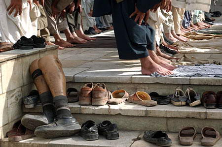 Afghan men pray at a Kabul mosque near the steps where they left their shoes, and where a land mine victim left his prosthetic legs.75